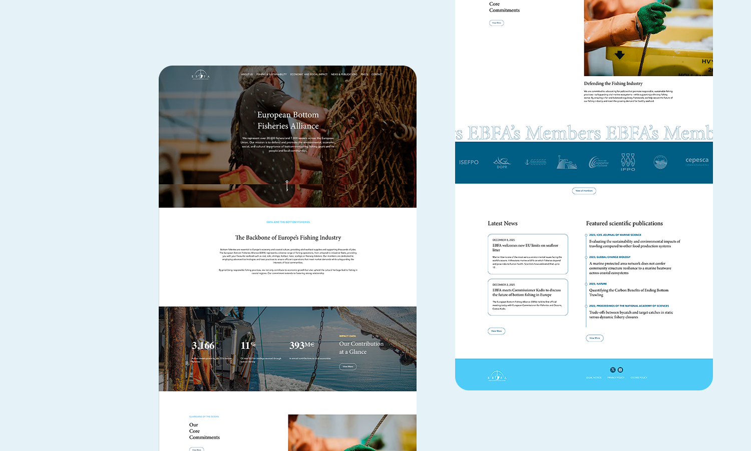 EBFA es una coalición europea dedicada a la protección de los ecosistemas marinos y al establecimiento de prácticas responsables en la pesca de fondo, promoviendo la colaboración entre diferentes organizaciones y actores del sector para lograr una gestión sostenible de los recursos marinos. Para la web de Bottom Fishing Alliance, se desarrolló un diseño completamente nuevo enfocado en la claridad, la accesibilidad y la identidad visual de la organización.